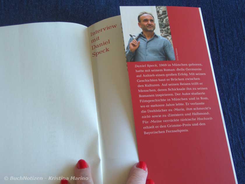 Als ich die broschierte Ausgabe zum ersten Mal in der Hand hielt, war ich angenehm überrascht. Das Buch ist aufwendig und informativ gestaltet. Auf der ausklappbaren Rückseite ist ein Interview mit dem Autor Daniel Speck, sowie ein Kartenausschnitt abgedruckt.